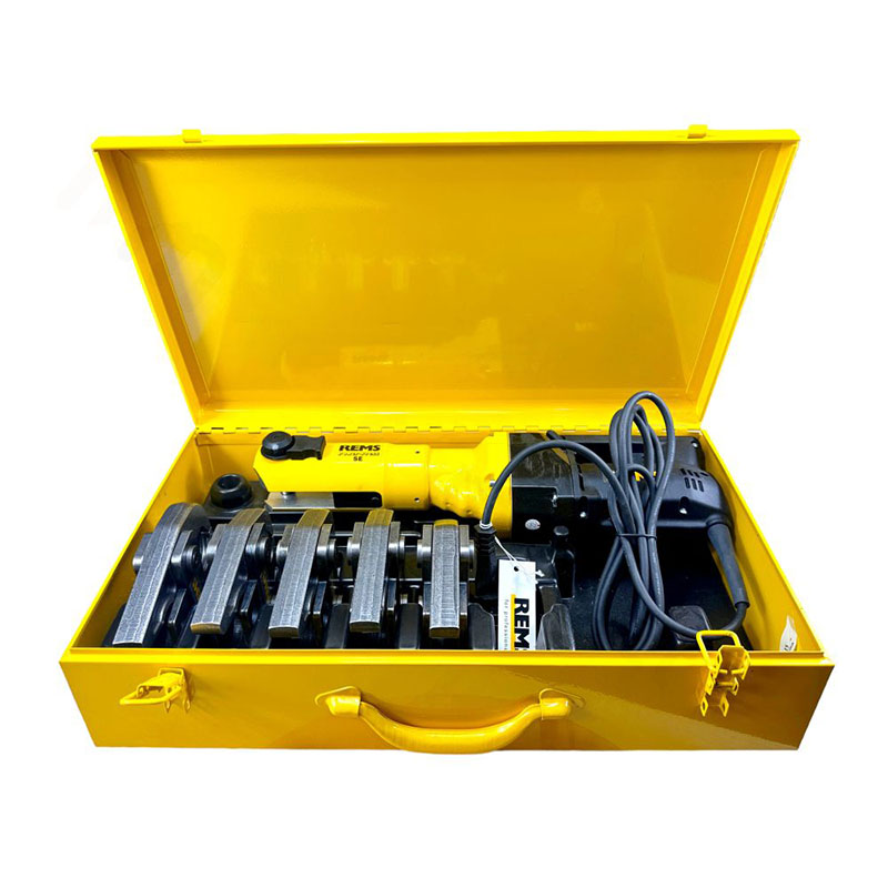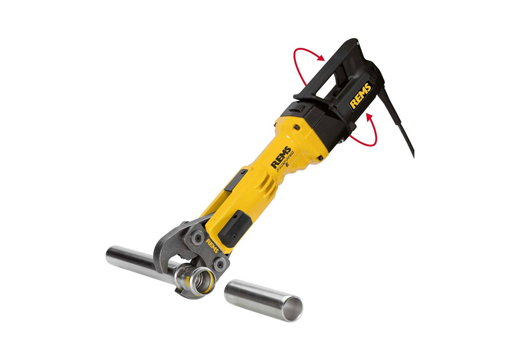W zestawie cęgi zaciskowe U do rur w rozmiarze 16, 20, 25, 32. REMS Power-Press SE – elektryczna zaciskarka do rur / prasa promieniowa 32kN do wykonywania połączeń zaciskowych Ø 10–108(110) mm, Ø ⅜ – 4″.
